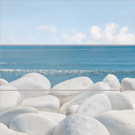 SET DE 3 PIEZAS DE REVESTIMIENTO 30X90 ESMALTADO CON UN IDÍLICO PAISAJE DE PIEDRAS BLANCAS Y FONDO DE OCÉANO CON CIELO . ESTAS TRES PIEZAS SE PUEDEN UNIR PERFECTAMENTE AL ZEN B QUE PUEDEN ENCONTRAR EN ESTA MISMA WEB.