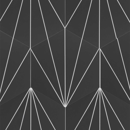 Pieza hexagonal de gres porcelánico de 28x33 cms., apta para suelos y paredes, decorada con figuras geométricas en color negro con líneas blancas.