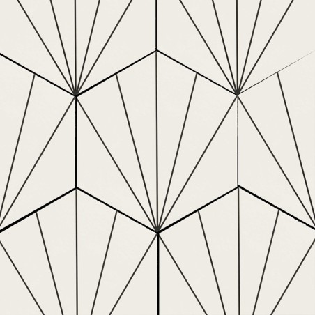 Pieza hexagonal de gres porcelánico de 28x33 cms., apta para suelos y paredes, decorada con figuras geométricas en color blanco con líneas negras.