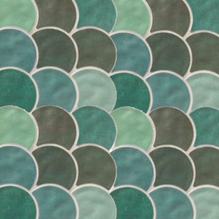 Pieza porcelánica de 30,7x30,7 cms con forma irregular y de colores mates aguamarinas d, una propuesta original de inspiración árabe que a base de "escamas" de pez aporta un alto poder diferenciador en cualquier pared de una casa o local comercial.