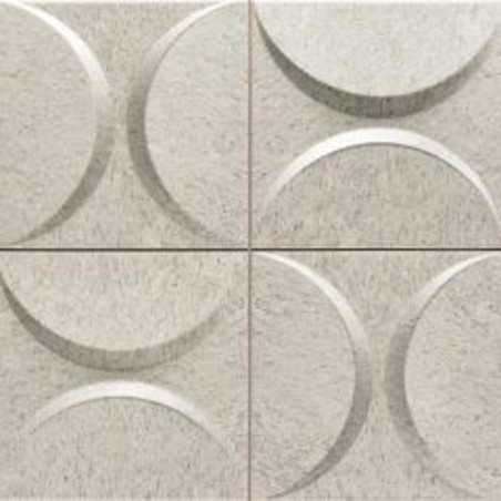 Pieza porcelánica de 32x32 cms. precortada en cuatro decoraciones con motivos de media luna y una sutil textura de piedra natural con acabados metálicos envejecidos. Ideal para decorar cualquier pared de tu vivienda o local comercial.