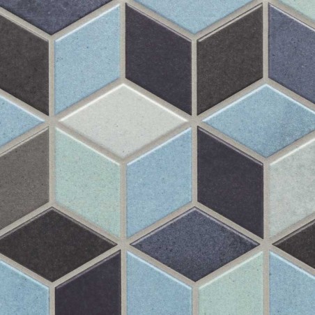 Pieza porcelánica de 26x51 cms con efecto tridimensional de rombos en colores blancos y azulados.