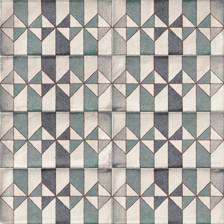 Una pieza cerámica de 15x30 centímetros. Esmaltada en brillo con decorado de figuras geométricas y con textura suave e irregular, dejando ver el desgaste propio del paso del tiempo. La colección essenzza es tal vez el azulejo de efecto vintage más logrado del momento.